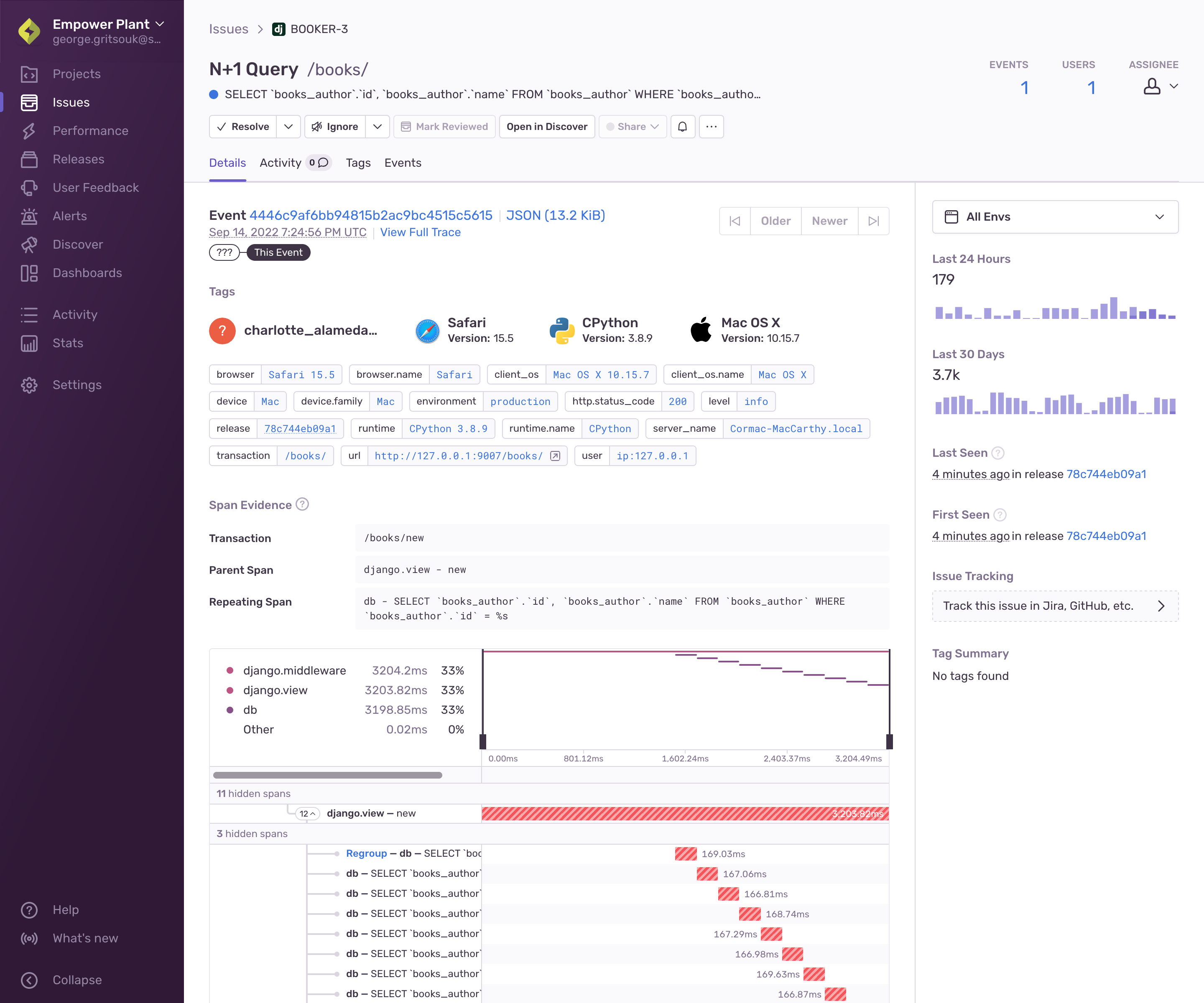 While the Issue Details page displays information about a specific transaction event that's part of an issue, you can navigate between the events of an issue using the "Older" and "Newer" buttons. On this page, you'll see information about the performance issue as well as the details of the most recent transaction event. The page also displays a summary of when the issue was seen, as well as a breakdown of the tags, span evidence, and breadcrumbs if they are available.