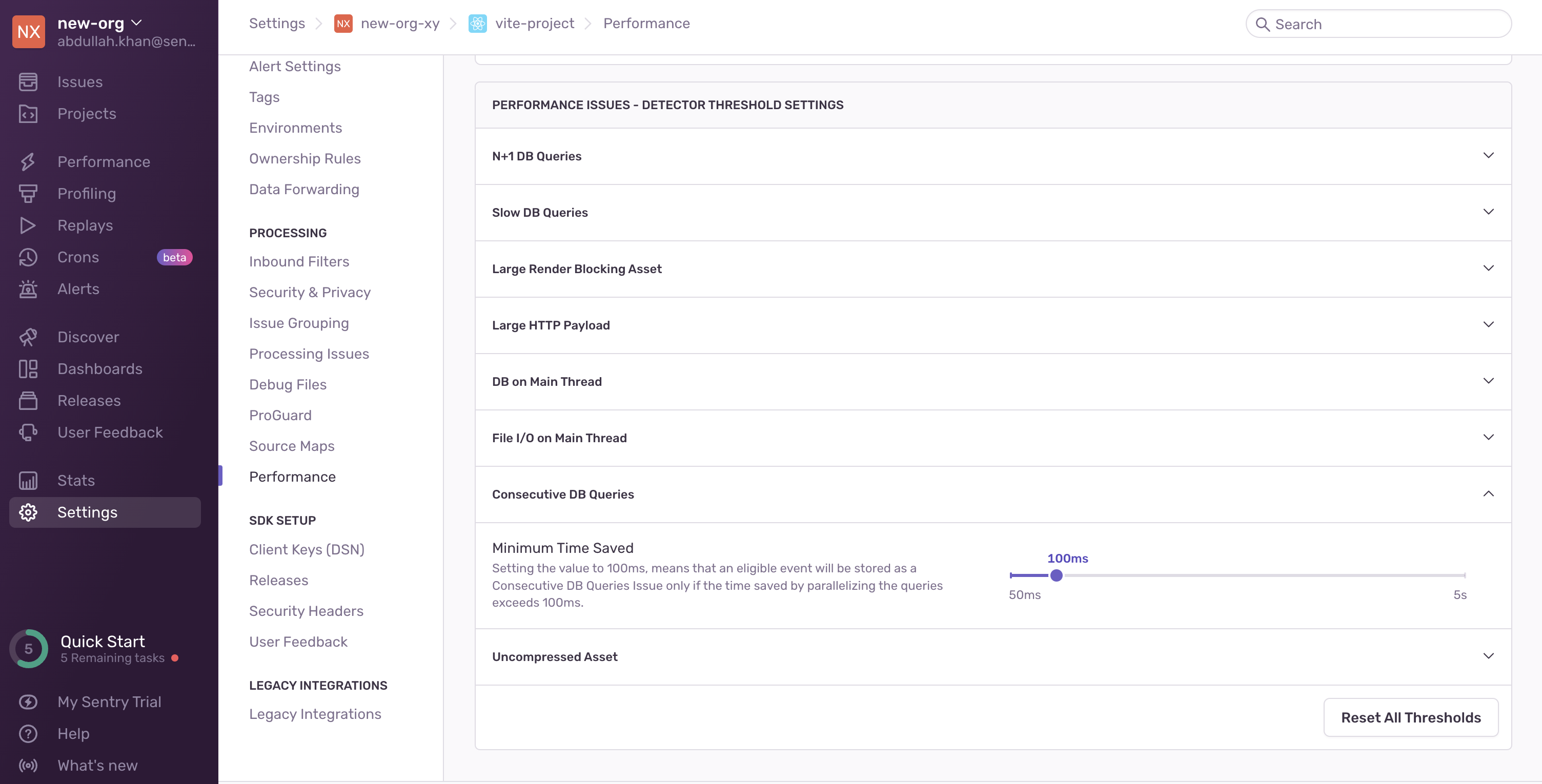 You can configure detector thresholds for Consecutive DB Queries issues in Project Settings > Performance: