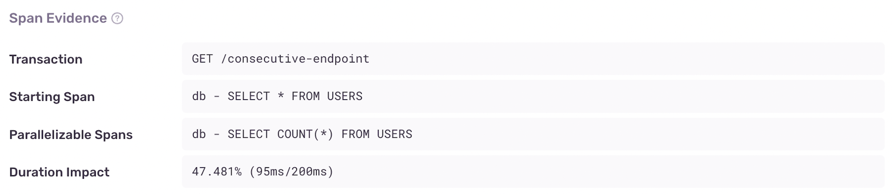 You can identify a Consecutive DB Queries problem by four main aspects in the "Span Evidence" section: